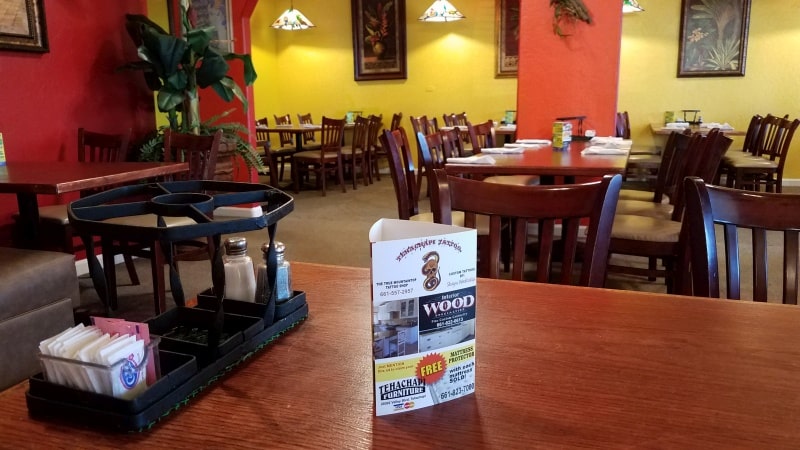 Table tents are placed on each table of the restaurant with business ads printed on one side.